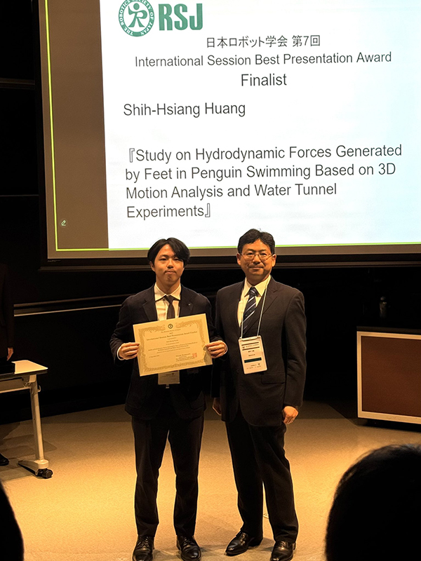 ・S. Huang, R. Kitahara, K. Takakura, D. Nojima, S. Uchiyama, and H. Tanaka, "Study on hydrodynamic forces generated by feet in penguin swimming based on 3D motion analysis and water tunnel experiments," in 第43回日本ロボット学会学術講演会, 東京科学大学, 東京, 9月2–5日 2025, pp. 1F3-05.
